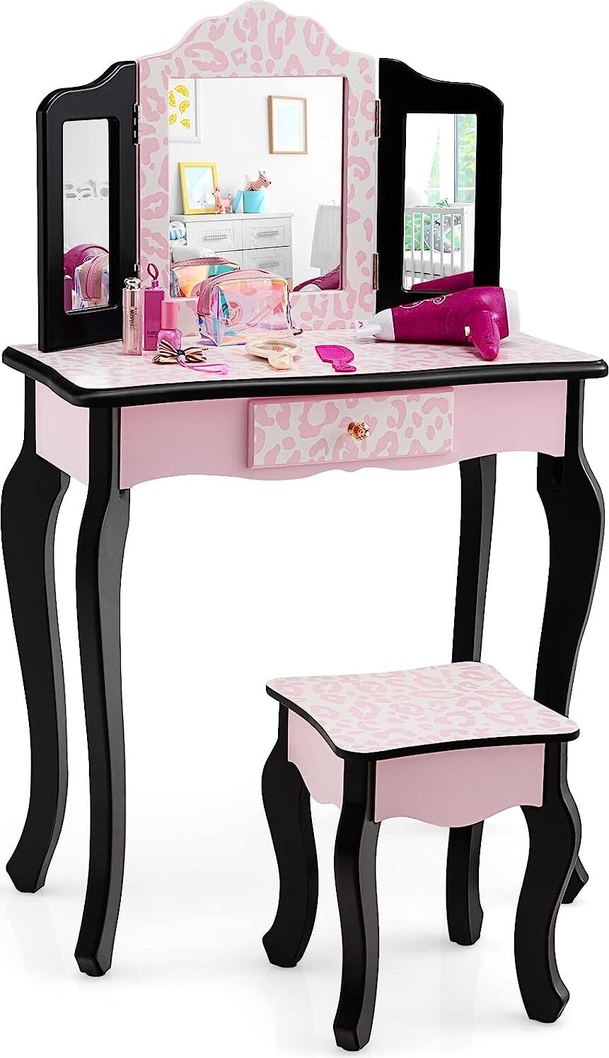 COSTWAY Coiffeuse pour enfants avec tabouret, 2 EN 1 Coiffeuse bureau avec miroir triple pli & plateau & tiroir amovibles, coiffeuse style princesse (Léopard)