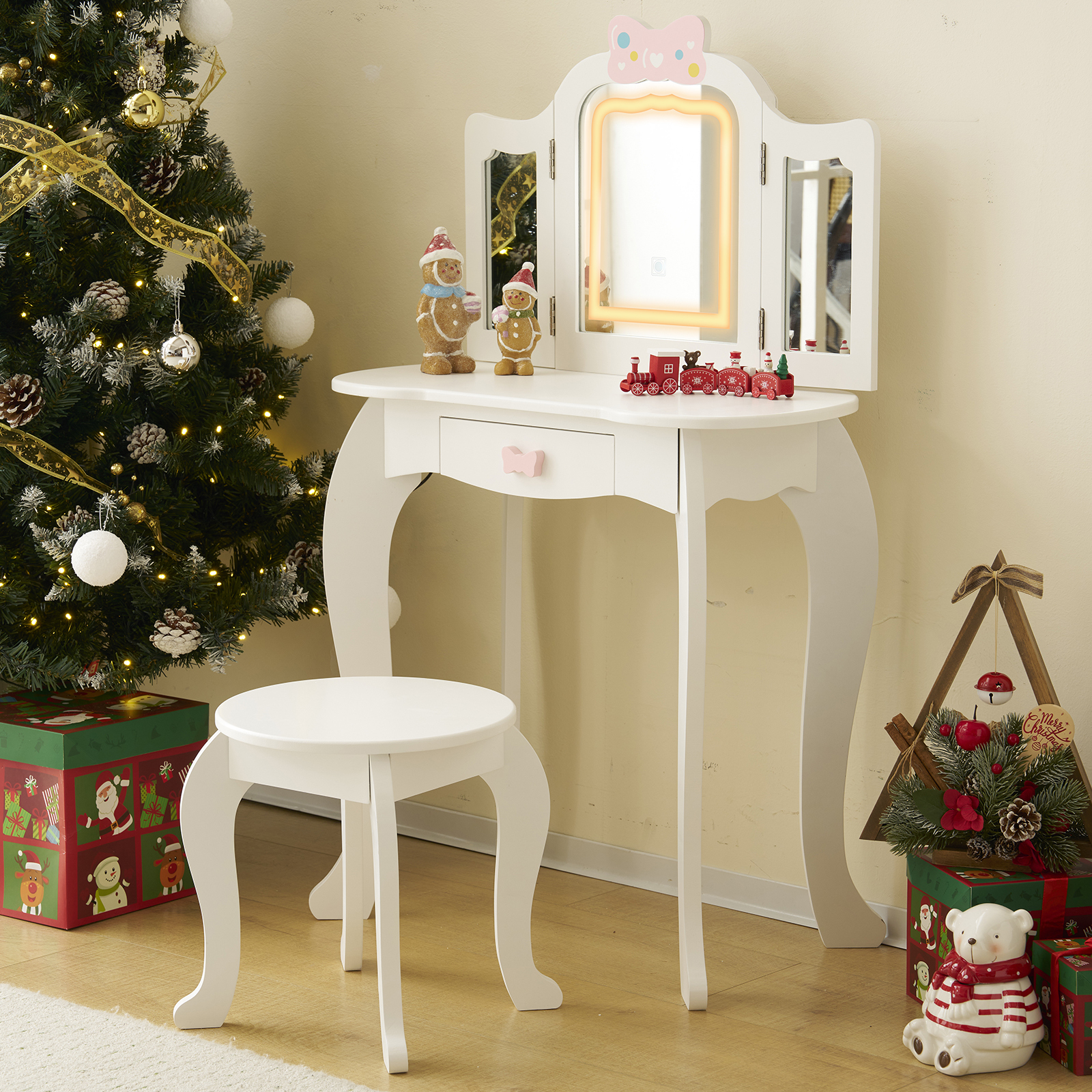 FCH Coiffeuse pour enfants avec tabouret éclairé par LED, miroir, coiffeuse de princesse avec triple miroir, luminosité réglable, blanc
