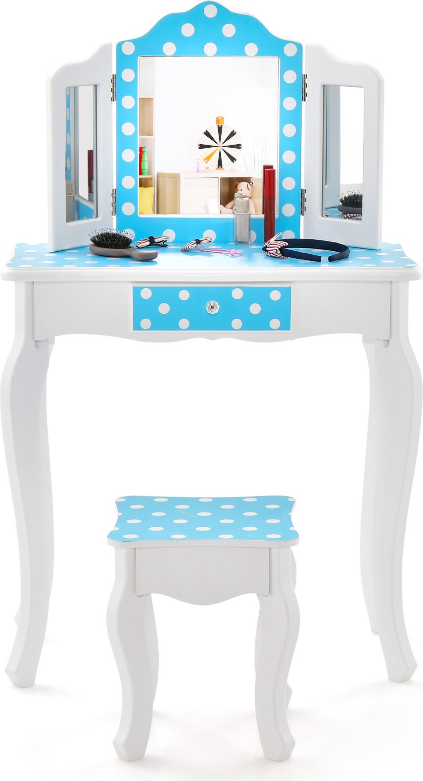 COSTWAY Coiffeuse pour enfants avec tabouret, coiffeuse style princesse (point-bleu)