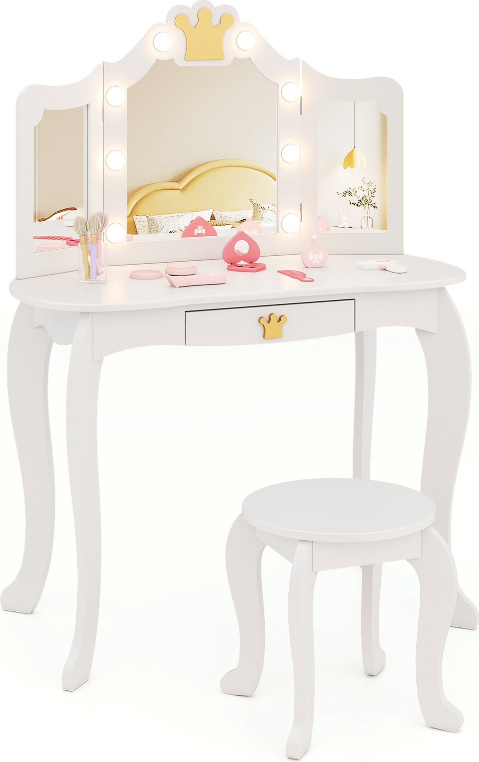 COSTWAY Coffret de maquillage pour enfants avec miroir éclairé, coiffeuse de princesse avec triple miroir, luminosité réglable Blanc