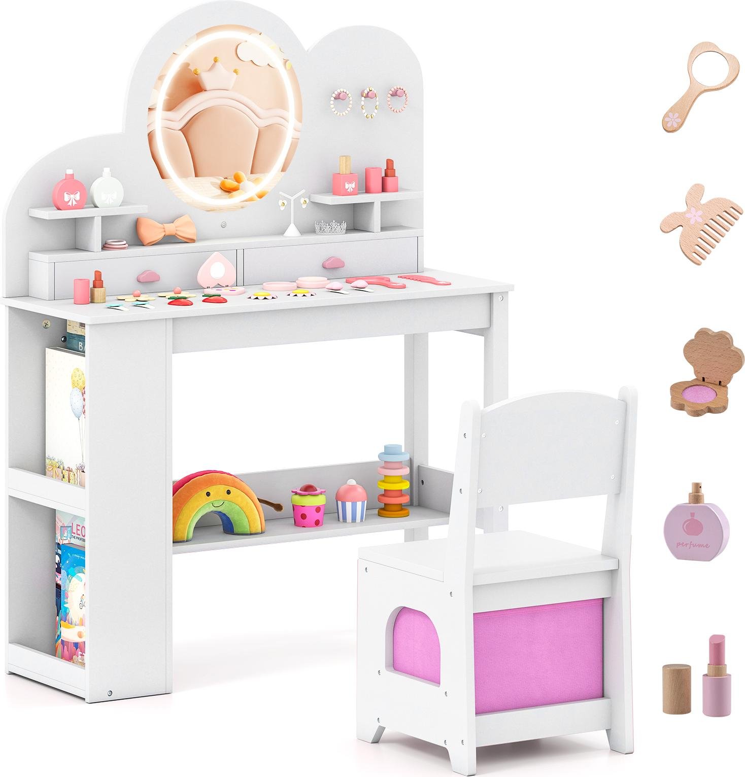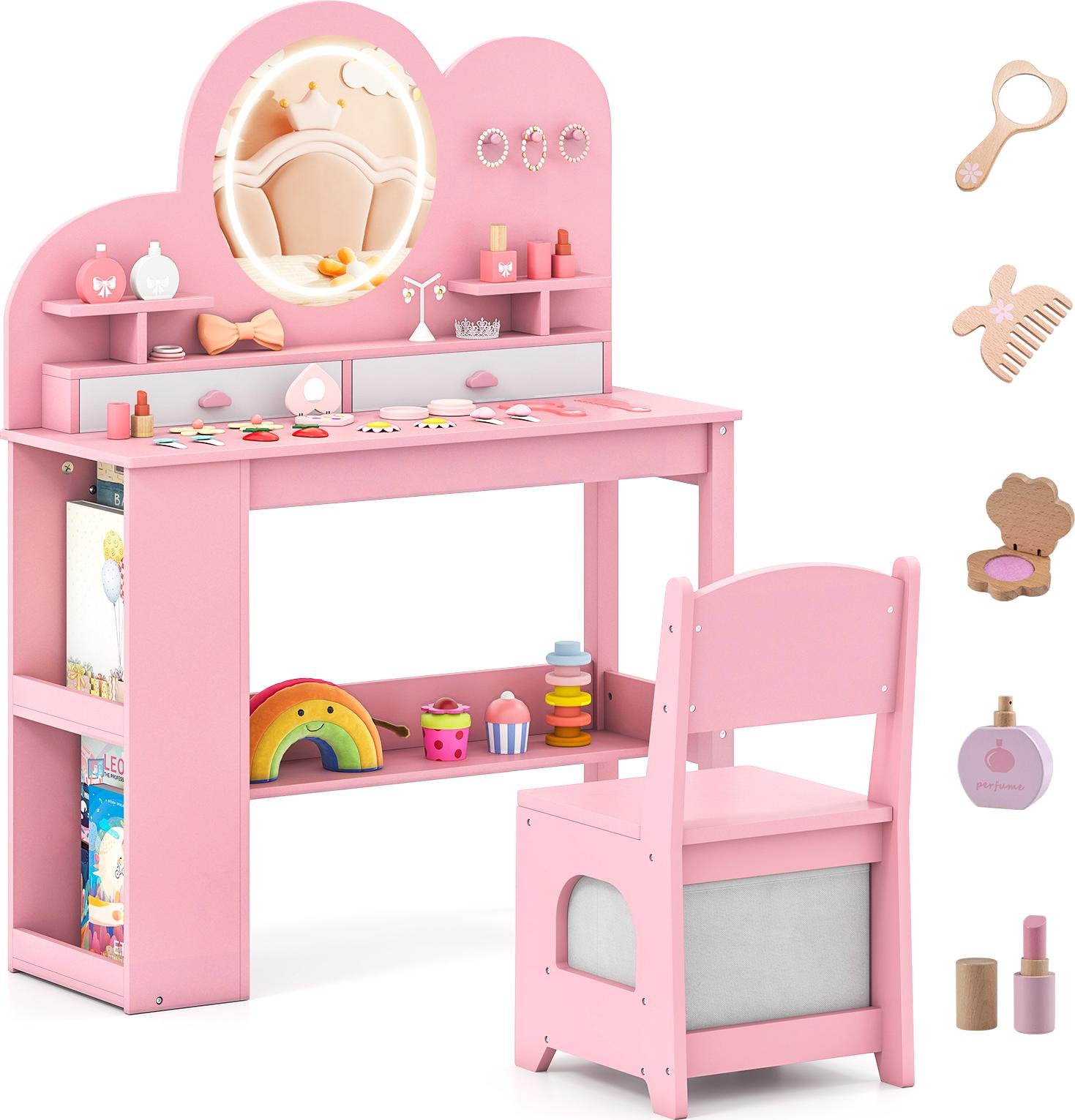COSTWAY 2in1 Coiffeuse pour enfants avec tabouret, éclairage, tiroir & organiseur à bijoux, coiffeuse en bois princesse pour enfants de 3 ans et plus Rose