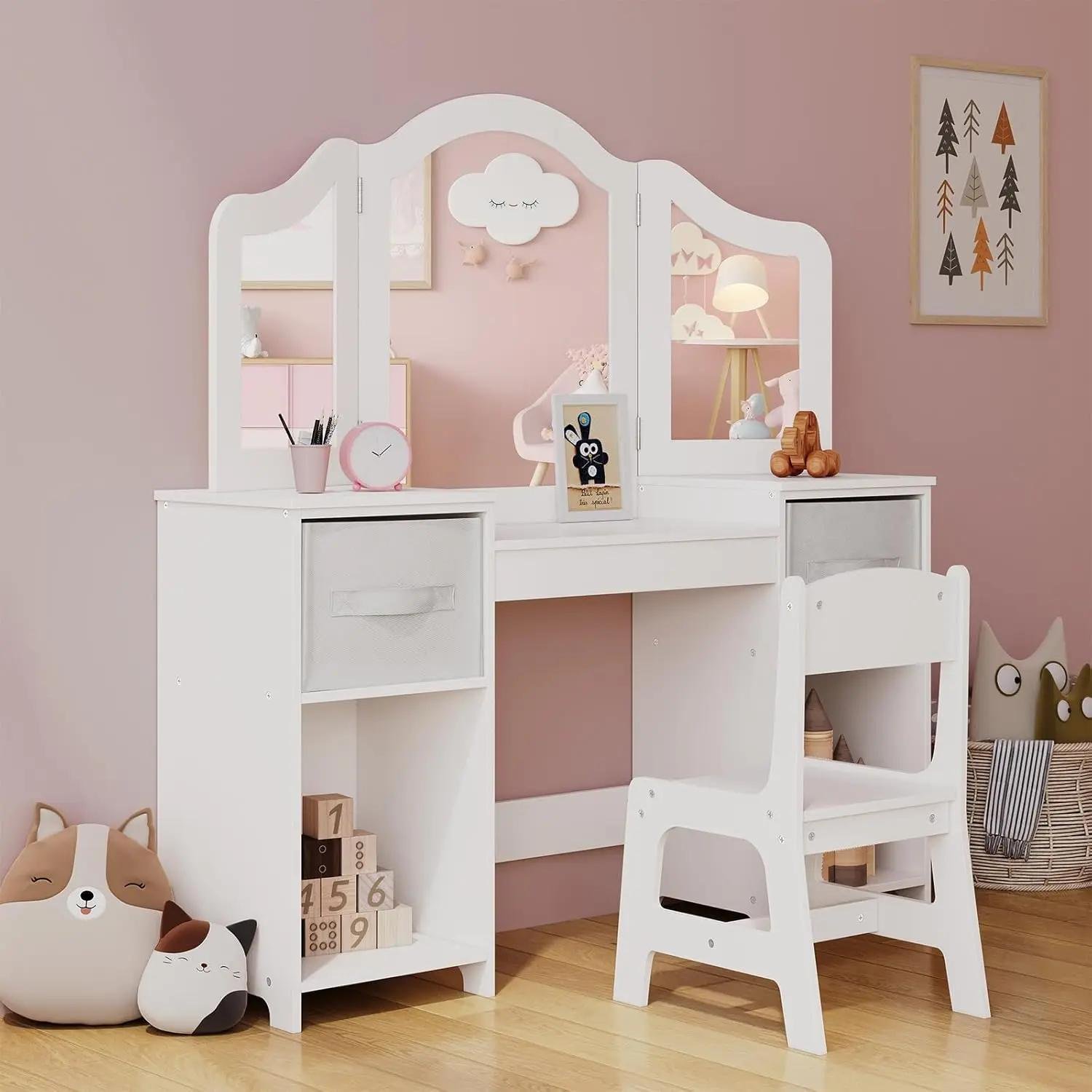 COSTWAY Coiffeuse pour enfants, Coiffeuse princesse avec miroir pliable, tabouret de maquillage et 3 tiroirs, Coiffeuse de maquillage pour enfants filles (Blanc)
