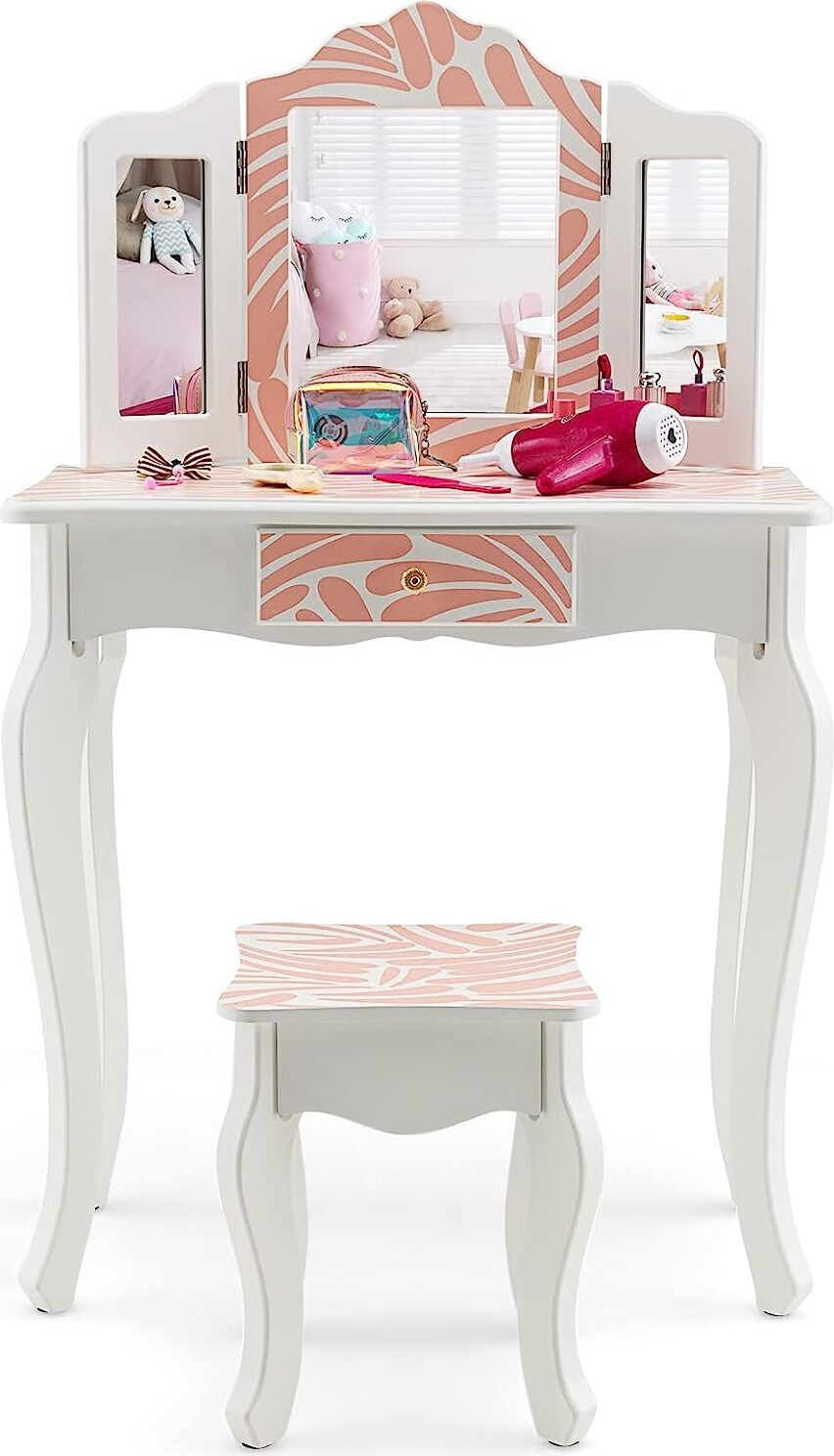 COSTWAY Coiffeuse pour enfants avec tabouret, 2 EN 1 Coiffeuse bureau avec miroir triple pli & plateau amovible & tiroir, coiffeuse style princesse (Zebra)