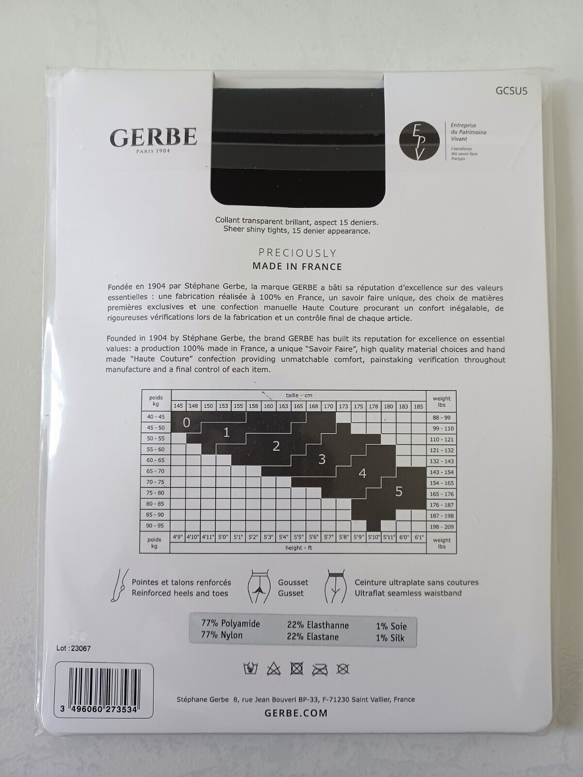 GERBE COLLANT SUN SATIN 15 DEN TAILLE 5 COULEUR NOIR REF GCS15