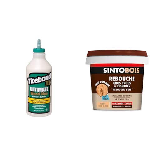 Titebond Ultimate 141/5 Colle à bois (943 ml) pour l'intérieur et l'extérieur, résistance maximale & Sinto Rebouche Bois pour Gros Trous et Fissures Bois Clair - 500 g - Facile et Prêt à l’Emploi