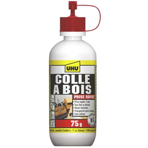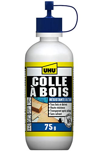UHU Colle à Bois Originale- Colle Bois Vinylique Extra Forte - Résistante à l'Humidité (D2) - Sans Solvant - Transparente après Séchage - Bouteille de 75 g