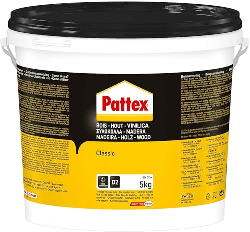 Pattex Bois Classic, colle à bois hautement résistante, colle vinylique pour montage, assemblage, placage ou contrecollage sur supports en bois, colle blanche, seau 5 kg
