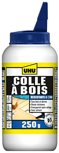 UHU Colle à Bois Waterproof - Colle Bois Vinylique Extra Forte et Résistante à l'eau (D3) - Intérieur/Extérieur - Sans Solvant - Transparente après Séchage - Bouteille de 250 g