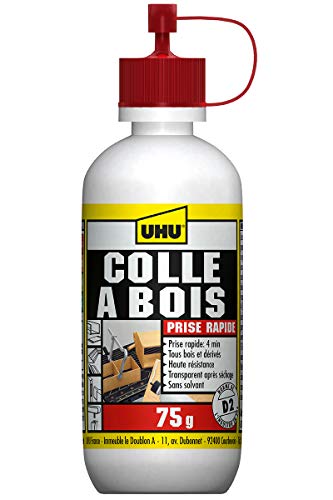 UHU Colle à Bois Express- Colle Bois Vinylique Extra Forte et Séchage Rapide - Résistante à l'Humidité (D2) - Sans Solvant - Transparente après Séchage - Bouteille de 75 g