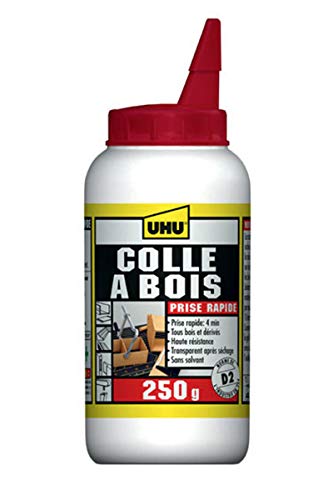 UHU Colle à Bois Express- Colle Bois Vinylique Extra Forte et Séchage Rapide - Résistante à l'Humidité (D2) - Sans Solvant - Transparente après Séchage - Bouteille de 250 g