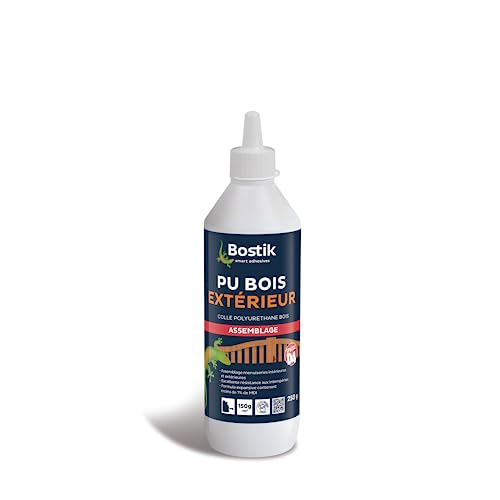 Bostik Colle PU Bois Extérieur – Colle Bois Polyuréthane Liquide & Colle Vinylique Bois R41 – Colle à Bois Prise Rapide – Colle d'Assemblage et de Placage du Bois – Blanc – Biberon de 750 g