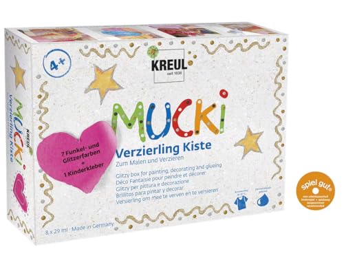 KREUL 24341 - Mucki Ornement 7 en 1 Set avec 7 crayons de couleur à 29 ml et 1 tube de colle pour enfants à 29 ml Peinture à effet scintillant, sans parabène, sans gluten, sans lactose, végétalien