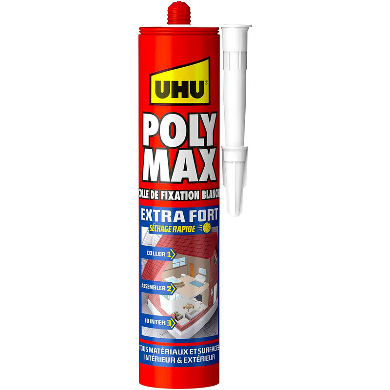UHU Poly Max - Mastic-Colle Extra-Fort Séchage Rapide - Pour Coller, Assembler, Jointer - Tous Matériaux & Surfaces - Intérieur/Extérieur - Sans Solvants - Blanc - Cartouche 425 g