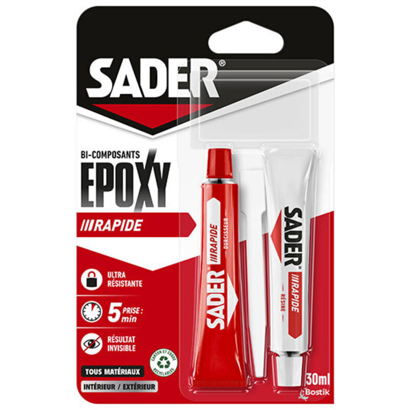 Colle époxy rapide 2 tubes 30 ml – Collage ultra résistant sur bois, métal, verre – Temps de prise 5 min – Résistance 130 kg/cm² – Sader