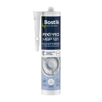 Mastic colle spécial polystyrène et moulures blanc Bostik Fixpro MSP 121, cartouche de 290 ml