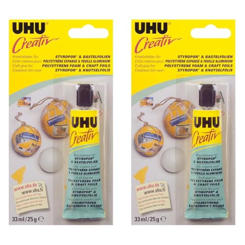 UHU colle Creativ' polystyrène expansé et feuille aluminium - forte, transparente, tube 33ml (Lot de 2)