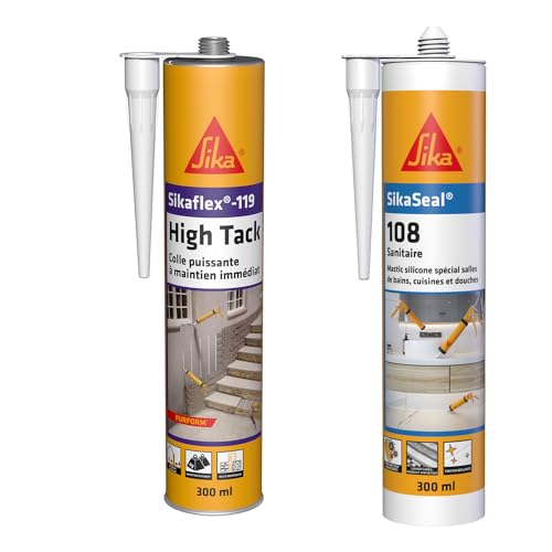 SIKA - Colle polyuréthane puissante - Pour fixation d'objets lourds - Intérieur et extérieur -Blanc -300ml + Mastic Silicone spécial salle de bain, cuisine et douche - Anti-moisissures - Blanc - 300ml