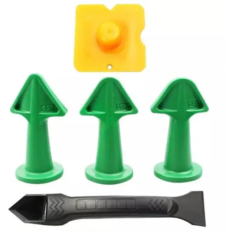Ensemble d'outils manuels 5 pièces comprenant un applicateur de calfeutrage, une spatule, une pelle et un embout pour colle plastique, ainsi qu'un
