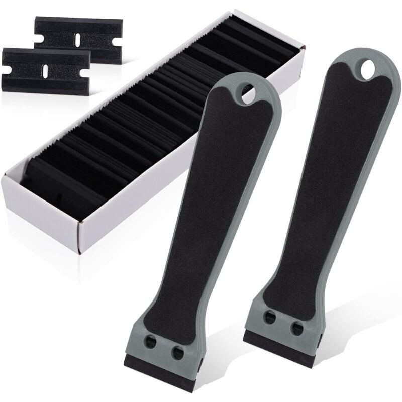 2 Grattoir Plastique avec 100 raclettes, Long Manche Grattoirs, pour Enlever les étiquettes, a colle, la peintureAutocollants et décalcomanies, gris