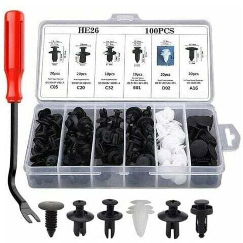 100 Pièces Clips Voiture Universel, 6 Taille Clips de Fixation Voiture Outils, Rivet Plastique, Agrafes Carrosserie pour Pare-Chocs Porte de Voiture