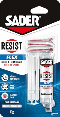 Sader Resist Flex – Colle Bi-Composants – Colle de Réparation Tout Support – Intérieur/Extérieur – Couleur : Translucide – 1 Seringue de 10 g (+ 3 embouts mélangeurs)