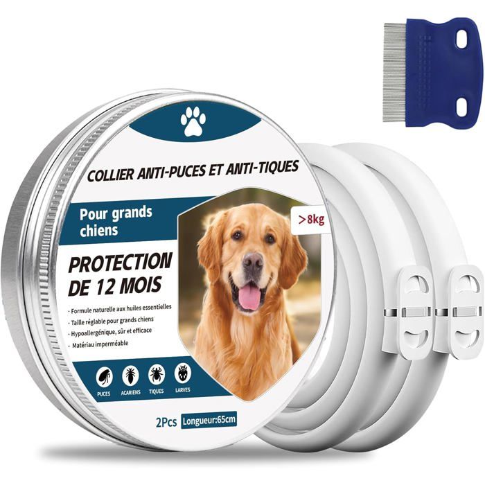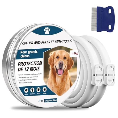 2 Pcs Collier Anti Puces pour Chien, 65cm Réglable Collier Anti-Puces et Tiques pour Chiens et Imperméable, 8 Mois Protéger (Gros Chien)