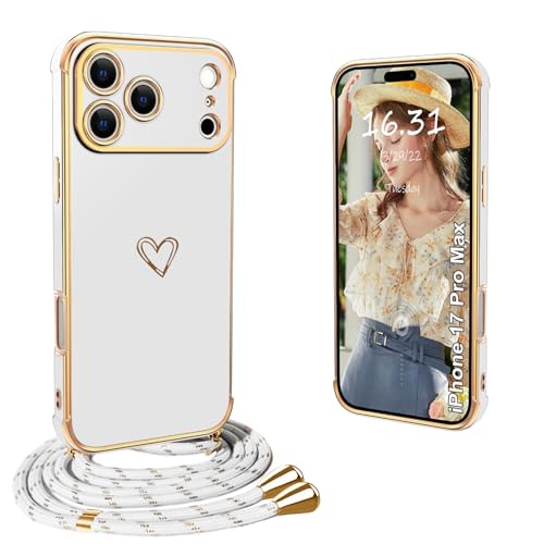 Yutwo Coque pour iPhone 17 Pro Max avec Cordon, Housse en Silicone Antichoc avec Motif Cœur et Collier iPhone 17 Pro Max Case, Blanc