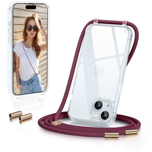 GOODVISH Coque pour iPhone 15 avec Cordon de Collier, Transparente Coque Bumper Etui Housse avec Cordon Réglable Téléphone Lanyard Case AntiChute Collier pour iPhone 15 Cover 6,1" TPU, Vin Rouge