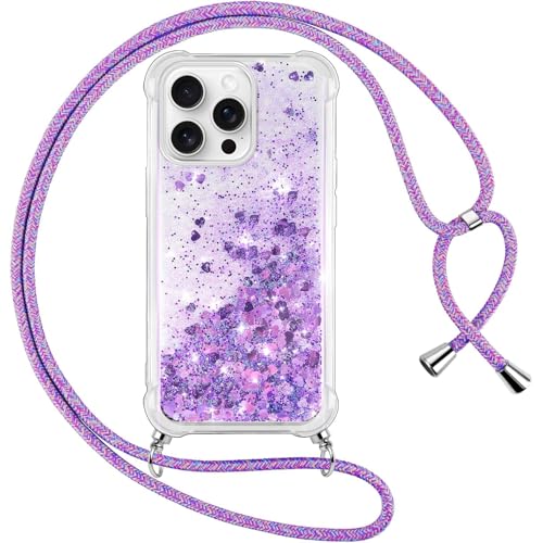 Vauki Coque pour iPhone 16 Pro avec Cordon, Paillette Liquide Transparent Crystal Glitter Housse, Protection Antichoc Silicone Souple TPU Bumper Case,Réglable Collier pour iPhone 16 Pro, Violet