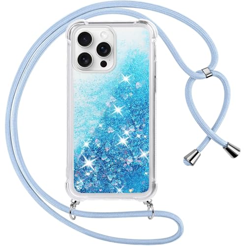 Vauki Coque pour iPhone 16 Pro avec Cordon, Paillette Liquide Transparent Crystal Glitter Housse, Protection Antichoc Silicone Souple TPU Bumper Case, Réglable Collier pour iPhone 16 Pro, Bleu