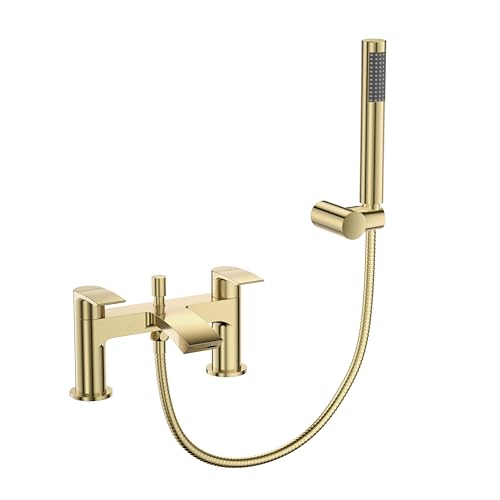 VeeBath Tidal Mitigeur bain/douche carré avec kit – Finition laiton brossé, double levier, robinet de baignoire moderne avec pomme de douche carrée, montage sur plateau, design contemporain pour