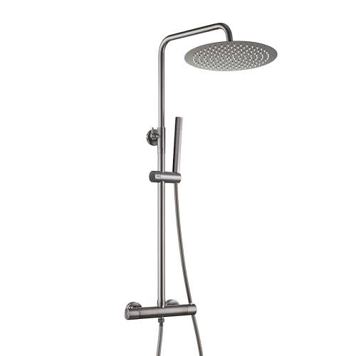 Görbach Système de douche avec thermostat, Colonne de Douche avec robinet, kit complet de douche à effet pluie, barre de douche en acier inoxydable, douche de tête ronde D25 cm, Gris gunmetal brossé