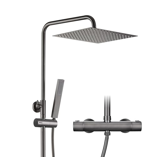 Görbach Système de douche thermostatique avec robinet, Ensemble de Douche pluie, Colonne de Douche acier inoxydable avec barre de douche, XXL pommeau de douche carré 30 x 30 cm Gris gunmetal brossé