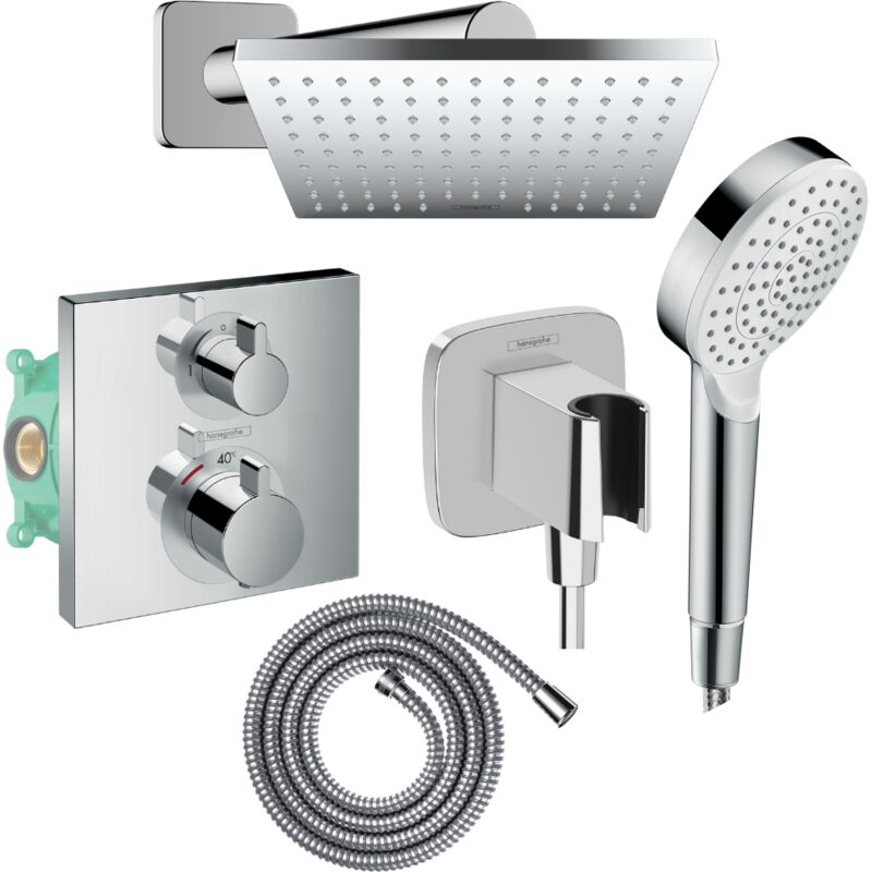 Colonne douche thermostatique Hansgrohe Ecostat Square Douche de tête Vernis Shape Flexible Metaflex Douchette Vernis Blend chromé