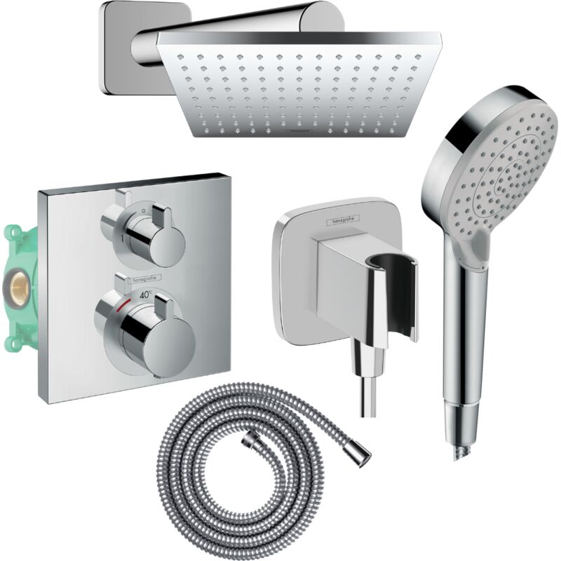 Colonne douche thermostatique Hansgrohe Ecostat Square Douche de tête Vernis Shape Flexible Metaflex Douchette Crometta chromé