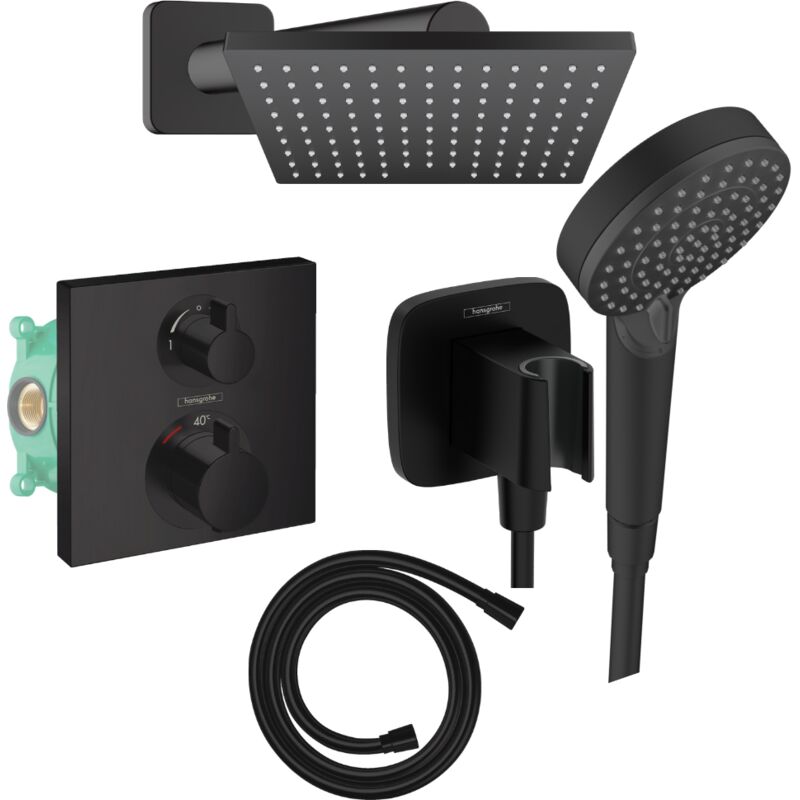 hansgrohe Vernis Shape - Colonne de douche avec mitigeur thermostatique, douche pluie avec robinet, douchette, support, flexible de douche, barre et douche de tête carrée 1 jet, Noir mat, 26286670