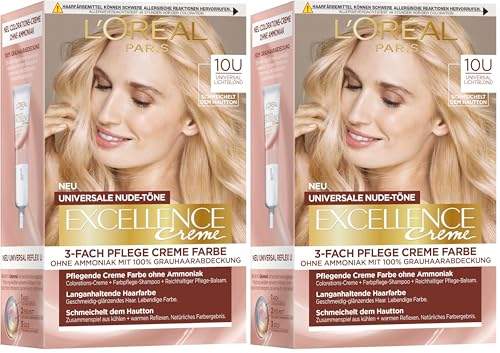 L'Oréal Paris Coloration permanente pour tous les tons de peau, coloration sans ammoniaque, tons nude universels avec couverture complète des cheveux gris, crème Excellence Crème, #10U Blond clair