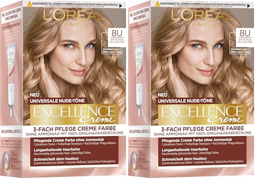 L’ORÉAL PARIS - Coloration Cheveux Cheveux Permanente - Sans Ammoniaque - Couvre 100% des Cheveux Blancs - Excellence Crème Universal Nudes - Nuance : Blond Clair Universel (8) (Lot de 2)