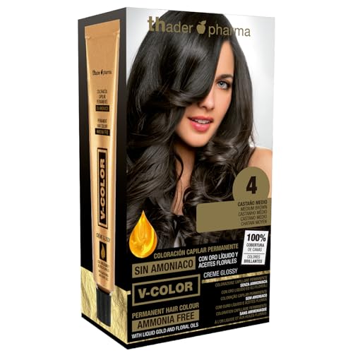 Thader Th Pharma V-Color Kit de coloration permanente sans ammoniaque avec or liquide 100% couverture des cheveux blancs, 120 ml (No 4 Châtain moyen)