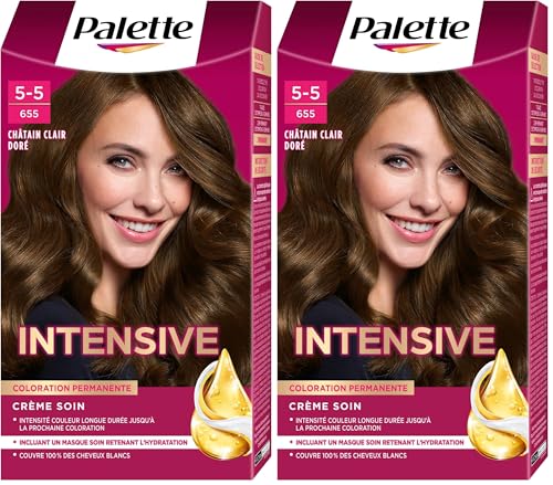 Schwarzkopf Palette, Coloration Permanente Cheveux, Crème Soin, Couvre 100 Pour cent des Cheveux Blancs, Tenue 8 semaines, Chatain Clair Dore 655, 1 Unité (Lot de 2)