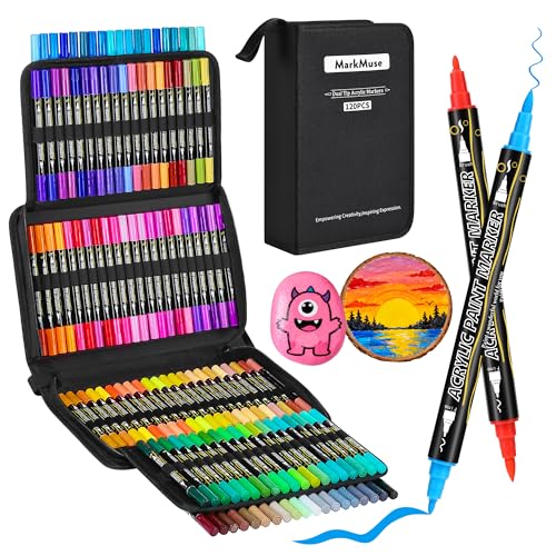 MarkMuse 120 Couleurs Feutre Acrylique, Stylos Acryliques à Pointe Pinceau pour le Coloriage Adulte,Acrylic Paint Markers pour Pierre, Bois, Toile, Verre, Céramique, Plastique