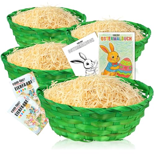 COM-FOUR® 4x paniers de Pâques avec 100 g d'herbe décorative, couleurs d'œufs et livre de coloriage - panier en raphia avec herbe de Pâques et couleurs d'œufs en 5 couleurs (Set nature marron 5)