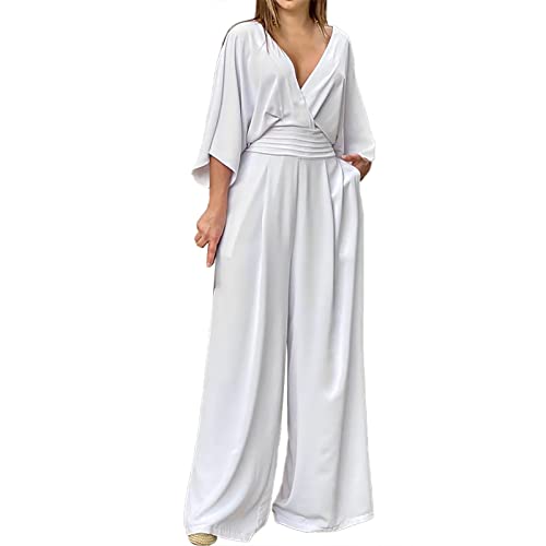 Combinaison Femme Chic pour Soirée De Travail Sexy Couleur Unie Col V Playsuit Manches Courtes DéContractéE Pas Cher Jumpsuit Taille Haute Pantalon Jambes Larges pour Travail Bureau