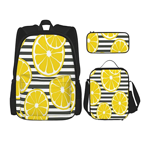 3 pièces ensemble sacs à dos citrons avec rayures noires et blanches imprimé été fruits frais livre sac voyage camping travail sac d'école trousse à crayons sac à lunch combinaison pour hommes femme