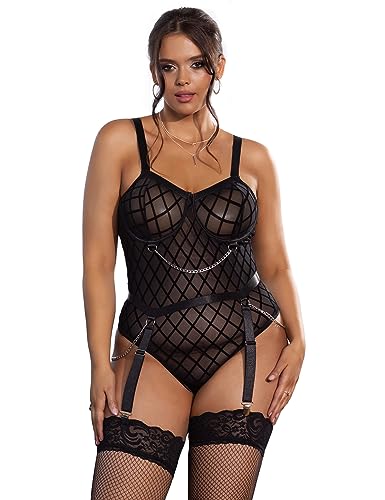 ohyeahlady Body Sexy Chic Avec Armature Grande Taille Body Dentelle Porte Jarretelle Harnais Ensemble Lingerie Tenu Dessous Hot Combinaison Lingerie Et VêTements Ouverte Deguisement Noir,XL-XXL