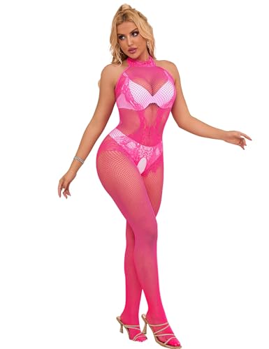 RSLOVE Lingerie pour Femmes Bodystocking Sexy en Résille Body Femme Combinaison en Maille Vêtements de Nuit Rose Taille Unique