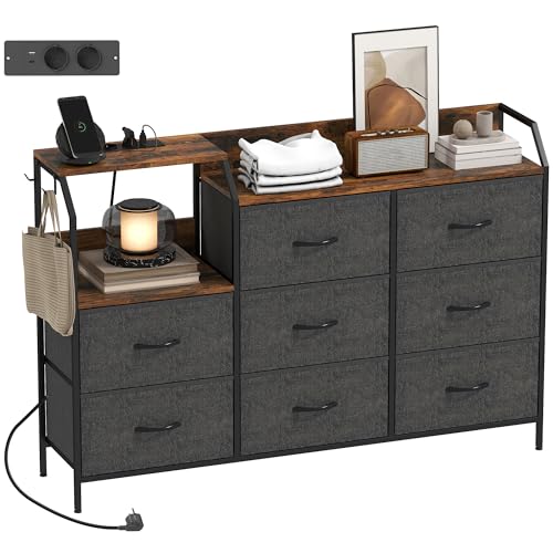 HOMCOM Commode avec Station de Recharge, 8 tiroirs en Tissu Pliables, Commode Chambre, Meuble de Rangement, étagère Ouverte et Crochets, Cadre en Acier, pour Chambre, Salon, Couloir, Marron Rustique