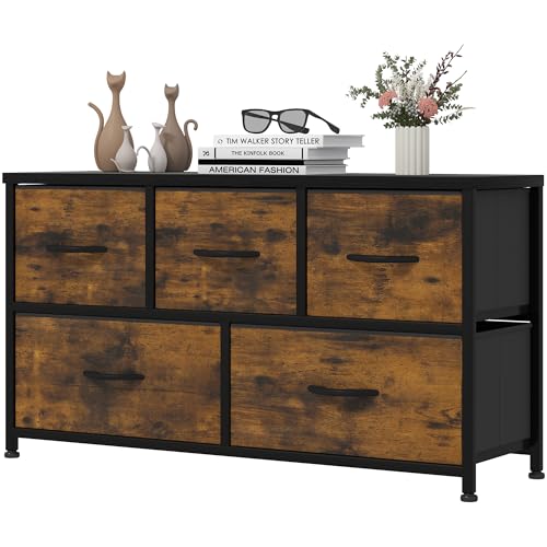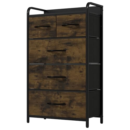YITAHOME Commode, 5 Tiroirs en Tissu Commode Chambre Meuble de Rangement, Cadre en Métal,pour Chambre à Coucher, Salon,Rouille Brun