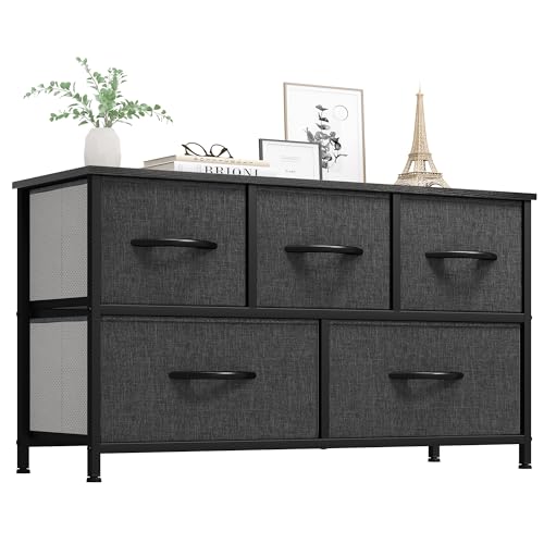 YITAHOME Commode, 5 Tiroirs en Tissu Commode Chambre Meuble de Rangement, Cadre en Métal,pour Chambre à Coucher, Salon,Gris Noir