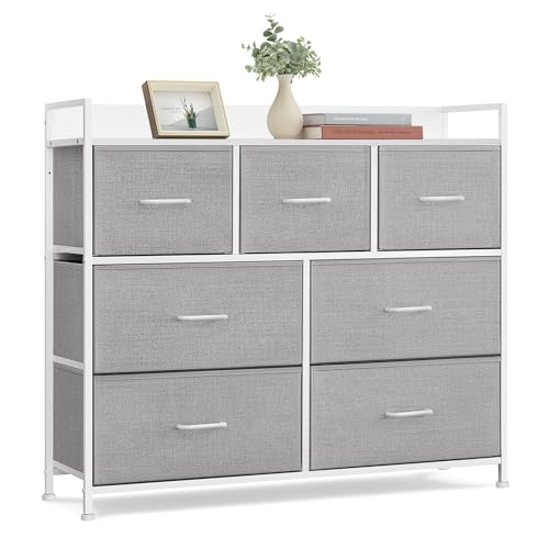 SONGMICS Commode, Armoire, Meuble de Rangement, 7 Tiroirs en Tissu avec Poignées, Cadre en Métal, Style Moderne, Gris Tourterelle et Blanc Nuage LTS523L10